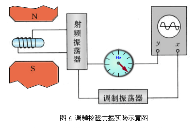 图6是调频率核磁共振示意图,样品(如水)装在小瓶中置于磁体两极之间,瓶外绕以线圈,由射频振荡器向它输入射频电流。这电流就向样品发射同频率的电磁波,其频率大致与外磁场 对应的频率相等。为了精确地测定共振频率,就用一个调频振荡器使射频电磁波的频率在共振频率附近连续变化。当电磁波频率正好等于共振频率时,射频振荡器的输出就出现一个吸收峰,它可以从示波器上看出,同时由频率计数器读出此共振频率。