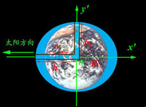 在实际中,日、月潮汐力的效果是线性叠加的,合成的结构与日、月的相对位置有关。下面利用牛顿设计的方法来计算潮汐的浪高,进而说明大潮和小潮的形成。如图5所示,设想在地球内部沿x'和y'方向分别挖一个竖井直达地心相通。二井深度分别为 先计算
