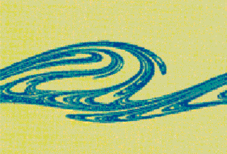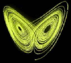 现在这个方程已成为混沌理论的经典方程。对此非线性方程求数值解,洛伦兹得到了一个三维吸引子,其二维投影如图10所示。总体上由两个套环组成,看上去像一对蝴蝶翅膀。实际上每一环套都有靠得很近的无穷多层,每层上都细密地排列看无穷多个回线,代表系统相点在这边转几圈后又到那边转几圈,完全无法预测什么时候从这一边过渡到另一边。 刻划混沌吸引子的主要手段为分形维数和李雅普诺夫指数。 分形概念的实质就是标度变换下的自相似性。图11即为单摆的混沌吸引子。由图中可以看出单摆混沌吸引子的分形结构,即自相似结构。 李雅普诺夫指数描述混沌吸引子的初值敏感性,单摆的李雅普诺夫指数计算证明,在计算的误差范围内,单摆具有混沌吸引子,是初值敏感的。