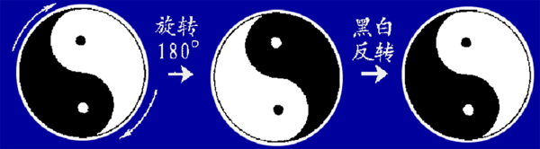 有时,单独位置变换不构成对称变换,但其几个位置变换的联合变换却是对称变换。比如,我国古代的阴阳图,围绕其中心旋转180度,相当于黑白互换;再黑白互换,即将两个变换联合起来,就实现了一个对称变换(如下图)。