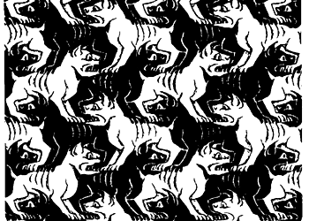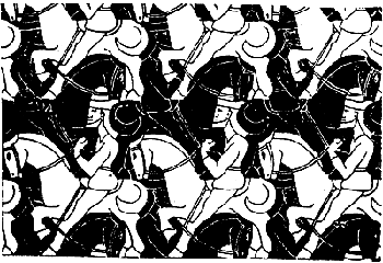 另一个精彩的例子:荷兰画家M.C.Escher设计的骑士图和猛兽图,是镜象反射、平移操作和黑白变换联合变换的结果(下图)。