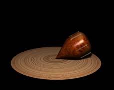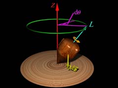 最常见的旋进就是陀螺的旋进。陀螺不旋转时就躺在地面上,如图3(a)所示。当使它绕自己的对称轴高速旋转时,即使轴线已倾斜,它也不会倒下来,而是旋进运动,如中图动画所示。
