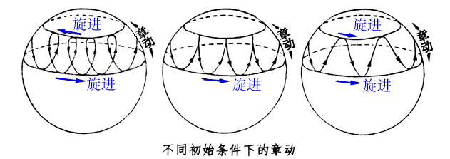 应该指出,前面讨论的各种旋进现象,如陀螺在重力距下的旋进等,都是在自旋角速度比较大的情况下出现的。在那里做了一个简化,认为刚体的总角动量就是它绕自己的对称轴自旋的角动量。事实上刚体在旋进过程中它的总角动量应该是自旋角动量和它的旋进的角动量的矢量合。当刚体高速旋转时,总角动量近似地等于飞轮的自旋角动量,这样就得出了(4)和(8)式。