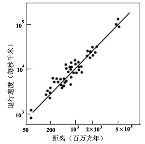 美国天文学家斯利费在1912年后发现星系光谱呈现红向位移现象,简称红移。如果将谱线的位移视为发射谱线的天体与观测者之间相对运动所产生的多普勒效应,这将意味着它们远离我们而去。到1926年,斯利费已积累了46个星系的红移资料,其中红移量小的相当于每秒几百千米的远离速度,大的达每秒几千千米。1929年, E.P.哈勃利用前人的观测资料和自己的测量数据,发现了星系视向退行速度v同距离D大致成线性关系的经验规律: 为哈勃常数。测定 是观测宇宙学最重要的课题之一。目前较为公认的数据为
