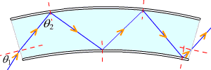 将一条折射率较高的玻璃纤维丝(纤芯)外包一层折射率较低的介质(包层),如光线射到纤芯与包层的分界面上的入射角处处大于临界角,则光线在纤芯内相继地从纤芯与包层间的界面上作全反射,从纤维的一端经很长距离传到另一端。这种起传光作用的玻璃丝叫做光学纤维,简称光纤。将数以万计的光学纤维组成一股光纤束,各条纤维内的光不会相互穿越,如将光纤束中各条光纤按一定顺序排列,则不仅能传递光能量,也能用来传递图像。 |