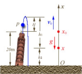 例题 01-01-05-04 在20m高的塔顶以 速度向上抛一石子P,求2s后石子离地面的高度。