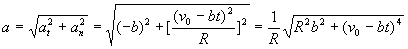 上式表明,加速度的法向分量 随时间t而改变。由上列两式可求质点在t时刻的加速度a(见图),其大小为