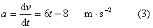 由(1)、(2)、(3)可分别求得质点在题设各时刻的位矢(即位置坐标)、速度和加速度分别为