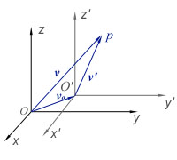设一运动物体P在某一时刻相对于参考系KK' 的位置,可分别用位矢表示;而运动参考系K'上的原点O'在基本参考系K中的位矢为,它们之间有如下的关系,即