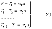 …所组成,并设各绳段的质量分别为 [图(d)]。今将各绳段选作隔离体,分析它们沿水平方向的受力情况:当第一段 的左端以力 拉第二段 的右端时, 段的右端就以反作用力 拉 段的左端。