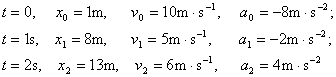由(1)、(2)、(3)可分别求得质点在题设各时刻的位矢(即位置坐标)、速度和加速度分别为