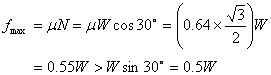 的静止状 态[图(c)],且在沿滑道的分力 作用下有下滑趋势。故受到沿滑道向上的静摩擦力 作用。为了判断此时货箱能否下滑,需先求出最大静摩擦力