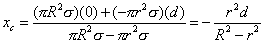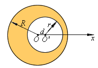 例题 01-04-04-05. 一半径为R的均质薄圆盘,开了一半径为r的圆孔,两圆中心O,O' 相距为d。求其质心。 解:设圆盘的质量面密度为 (即每单位面积的质量),则无孔大圆盘的质量为 ,质心坐标为 =0,小圆盘的质量为: , 质心坐标为 =d,因此所求圆盘的质心坐标为