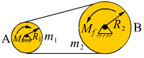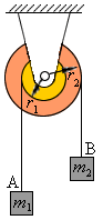 作业 01-05-03-10 两个重物A,B的质量分别为,,并分别系于两条绳上,这两绳又分别绕在半径为,,且装于同一轴的两个鼓轮上(如图4)。重物在重力的影响下运动,鼓轮和绳的质量,轴对鼓轮的摩擦均略去不计,试证鼓轮的角加速度为
