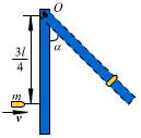 作业 01-05-04-03 一条长度为l=0.40m、质量为M=1kg的均质杆,铅直悬挂。试求:当一颗质量为 kg的子弹以水平速度 在距轴O为3l/4处射入杆内时,此杆的角速度。