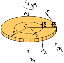 作业 01-05-04-02 一半径为r的水平均质圆形转台,以匀角速度 绕通过其中心的铅直轴转动(如图2)。台上站有四人,质量各等于转台质量的1/4;二人站于台边,二人站于距圆心r/2处。设台边的二人相对于圆台以速度v循转台的转向沿圆周走动,另二人相对于转台以速度2v逆转台的转向沿圆周走动,求转台的角速度 ;若四人都顺转台的转向走动,求转台的角速度 。