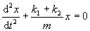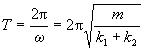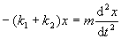 作业 02-06-02-03 处于原长状态的两条水平轻弹簧(劲度系数分别为 和 )与质量为m的物体相连(如图),不计摩擦力,试证此振动系统沿水平面振动时的周期为 证明:已知两弹簧的劲度系数分别为 和 ,以两弹簧为原长时物体的平衡位置为坐标原点O,Ox轴的正向如图所示。当质量为m的物体位移为x时,它所受的弹性力 和 都沿x轴负向,其合力为
