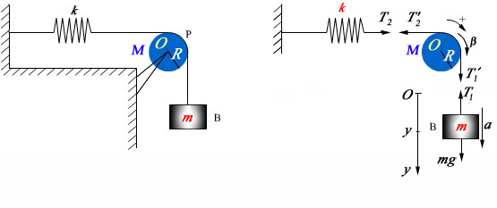 作业 02-06-02-04 如图(a)所示,一劲度系数为k的轻弹簧的一端固定,另一端用细绳与质量为m的物体B连接,细绳跨过固定于桌边的定滑轮P上,物体B悬于细绳下端,定滑轮P为均质圆盘,其半径为R,质量为M。求证:物体B在运动时作简谐振动;并求其角频率。所有摩擦阻力均不计。