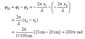 例题02-07-04-02 在例题 02-07-04-01中,求处两个质元振动的相位差。 解: 由式 在处两质元的振动分别比原点O落后一初相 由于同频率的两个振动,其相位差即为初相差,故两点的相位差为