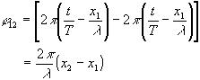 现在我们来讨论上述行波在传播过程中各点上质元振动的相位关系。在同一时刻t,与原点O分别相距为 和 的两点上,质元振动的相位差可按式(2)确定: