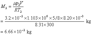 例题 03-08-02-03 一容器内盛有氧气 0.100kg ,其压强为 , 温度为320K,因容器开关缓慢漏气,稍后测得压强减为原来的5/8,温度降低到300K。求:(1)容器的体积;(2)在两次观测之间漏掉多少氧气。(氧气摩尔质量为) 解:(1)由理想气体状态方程: 得容器的体积为 (2)设漏气后剩余的氧气为,由,得