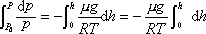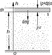 处取一薄层空气为研究对象,其底面积为 S ,厚度为 设空气为理想气体,在高度为h处的微小体积 考虑到薄层空气受的重力为 其上、下两面的大气压强分别为(p+dp)和p ,从力学平衡条件给出 得 将①式代入②式得 将③式右侧的 p 移到左侧,再两边积分,取地面处h=0,大气压强为 |