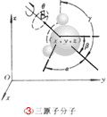 (2)刚性双原子分子如氢 、氧 、氮 、一氧化碳CO等分子,两个原子间联线距离保持不变。就像两个质点之间由一根质量不计的刚性细杆相连着(如同哑铃)(图2),确定其质心O’的空间位置,需3个独立坐标(x,y,z);确定质点联线的空间方位,需两个独立坐标(如α,β),而两质点绕联线的的转动没有意义。所以刚性双原子分子既有3个平动自由度,又有2个转动自由度,总共有5个自由度 i = t + r =3 + 2 = 5(图2)。
