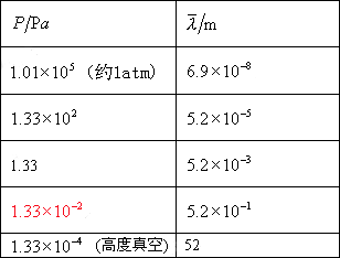 请看0℃的空气分子( )在不同压强下的平均自由程的计算结果列表,如下表所示。