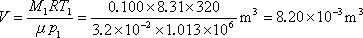 例题 03-08-02-03 一容器内盛有氧气 0.100kg ,其压强为 , 温度为320K,因容器开关缓慢漏气,稍后测得压强减为原来的5/8,温度降低到300K。求:(1)容器的体积;(2)在两次观测之间漏掉多少氧气。(氧气摩尔质量为) 解:(1)由理想气体状态方程: 得容器的体积为 (2)设漏气后剩余的氧气为,由,得