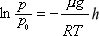 处取一薄层空气为研究对象,其底面积为 S ,厚度为 设空气为理想气体,在高度为h处的微小体积 考虑到薄层空气受的重力为 其上、下两面的大气压强分别为(p+dp)和p ,从力学平衡条件给出 得 将①式代入②式得 将③式右侧的 p 移到左侧,再两边积分,取地面处h=0,大气压强为 |