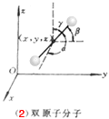 (2)刚性双原子分子如氢 、氧 、氮 、一氧化碳CO等分子,两个原子间联线距离保持不变。就像两个质点之间由一根质量不计的刚性细杆相连着(如同哑铃)(图2),确定其质心O’的空间位置,需3个独立坐标(x,y,z);确定质点联线的空间方位,需两个独立坐标(如α,β),而两质点绕联线的的转动没有意义。所以刚性双原子分子既有3个平动自由度,又有2个转动自由度,总共有5个自由度 i = t + r =3 + 2 = 5(图2)。