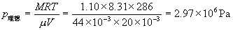 03-08-11-01 已知CO2气体范德瓦耳斯修正量 ,b = ,试用范德瓦耳斯方程计算密闭于容积为V=20 升容器内,质量M=1.10Kg,温度为13℃的 CO2 气体压强(),并与用理想气体状态方程求出的压强进行比较 解:由范德瓦耳斯方程: