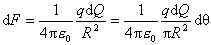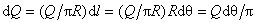 解 如图所示,取以圆心O为原点的坐标系 ,在与 轴成 角处沿细杆取一圆弧形线元 , 为对应于 的中心角。由题设可知,细杆均匀带电,故半圆周上每单位长度所带的电荷(称为线电荷密度,其单位是 )是相同的,因此,它的值为 ,因而,线元 上所带电荷为 ,按库仑定律,电荷元 对点电荷 作用的静电力大小为