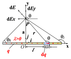 分析 为了求点 的场强,首先把沿细棒连续分布的场源电荷分割成无限多个电荷元 ,求出每一电荷元在点 的场强 ,然后根据电场强度叠加原理,用积分法,求点 的总场强 。