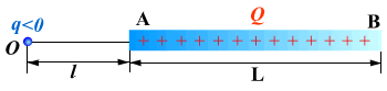 如图所示,一长度为 的均匀带电细棒 ,带正电荷 ,今将一带负电的点电荷 放在细棒延长线上的O点,
