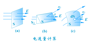 在均匀电场中,如果面积为 的平面,它与场强 的方向相垂直(上图(a))。根据上式,穿过 面的电通量为