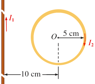 作业 04-13-05-06 一长直导线与一圆形回路分别载有电流 , ,放置如图,求圆形回路中心O点的磁感强度。