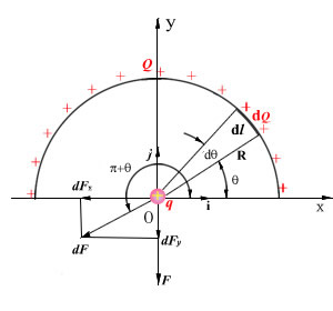 例题 04-10-02-03 在半径为 的均匀带电的半圆弧形塑料细杆上,均匀地分布着正电荷 ,求它对位于圆心O处的点电荷 ( )的作用力。