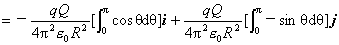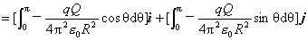 式中, 、 分别为x和y轴正向的单位矢量, 、 分别为 沿x、y轴方向的分量。将式(a)代入式(b),并化简,然后,按静电力叠加原理,求所有电荷元 对点电荷 作用力的矢量和,即对式(b)进行矢量积分,便可求得电荷 对点电荷 所作用的静电力的合力,即(注:对矢量求积分时,可在所取直角坐标系 中,先将矢量写成正交分解式,考虑到其中的单位矢量 、 都是恒矢量,积分时,可以把它们提到积分号外面,因而,只须分别对两个分量求标量积分。这样,