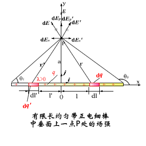 这是因为细棒对称于中垂线 ,棒上对称于中垂线 的每一对等量的电荷元(例如,线元 和 ’在中垂线上任一点 的场强 和 ’,也对中垂线 对称,以致垂直于 的每一对分量 、 成对地互相抵消,因而总场强 沿 轴的分量 ;同时,它们沿 的每一对分量 、 ,方向相同,都沿 轴正向,因而互相叠加,其和即为上式中的 。故中垂线上一点P的总场强为 ,即