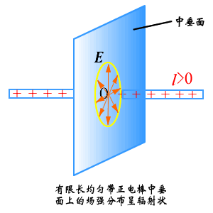 从式(b)可知,凡位于中垂面内的所有中垂线上、且与带正电细棒相距为 的场点(它们都在以细棒与中垂面的交点 为中心、以 为半径的圆上),其场强 的大小均相同,方向都沿相应的中垂线而背离细棒。亦即,在有限长的均匀带电细棒的中垂面上,场强分布呈辐射状。但对中垂面以外的场点则并非如此,其场强应按式(a)确定。