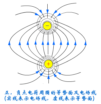 下面两幅图是按照上述规定画出来的两种电场的等势面和电场线图。在第二幅图中,读者试解释离带电体越远处的等势面,其形状为什么越近似于一球面?