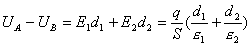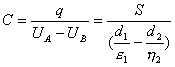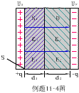 例题 04-11-03-02 设有面积为 的平板电容器,两极板间填充两层均匀电介质,电容率分别为 和 (如图),厚度分别为 和 。求这电容器的电容。