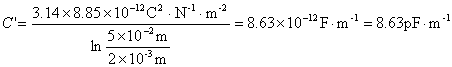 设r=2mm ,d=5cm;电介质为空气,即 ,代入上式,得平行的"无限长"直导线上单位长度的电容为: