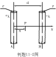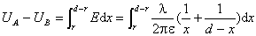 解:先假设两条导线A、B均匀带电,线电荷密度分别为+λ和-λ,沿垂直于两导线的方向取x轴(如图),原点O取在导线