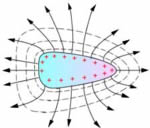 2)对于形状不规则的孤立带电导体,表面上曲率愈大处(例如尖端部分),面电荷密度愈大。因此单位面积上发出(或聚集)的电场线数目也愈多,附近的电场也愈强(见左图)。由此可知,在带电导体的尖端附近存 在着特别强的电场,导致周围空气中残留的离子在电场力作用下会发生激烈的运动,与尖端上电荷同种的离子,将急速地被排斥而离开尖端,形成“电风”;与尖端上电荷异种的离子,因相吸而趋向尖端,并与尖端的电荷中和,而使尖端上的电荷逐渐漏失。急速运动的离子与中性原子碰撞时,还可使原子受激而发光。这些现象称为尖端放电现象。(详细解释)