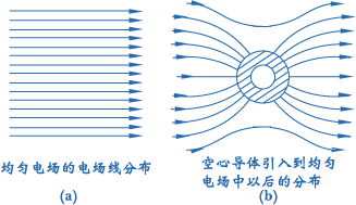 前面讲过,在导体空腔内无其他带电体的情况下,导体内部和导体的内表面上处处皆无电荷,电荷仅仅分布在导体外表面上。所以腔内的场强和导体内部一样,也处处等于零;各点的电势均相等,而且与导体电势相等。因此,如 果把空心的导体放在电场中时,电场线将垂直地终止于导体的外表面上,而不能穿过导体进入腔内。这样,放在导体空腔中的物体因空腔导体屏蔽了外电场,而不会受到任何外电场的影响(左图);另一方面,我们也可以使任何带电体不去影响别的物体。