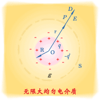 根据以上所述,我们先来讨论一个半径为 、电荷为 的导体球(左下图),在它周围充满电容率为 的无限大 均匀电介质中任一点的场强和电势。上一章说过,在没有电介质时,均匀分布在导体球表面上的自由电荷所激发的电场是球对称的;而今在球的周围充满均匀电介质,束缚电荷将均匀分布在与导体球表面相毗邻的介质边界面上,它无异是一个均匀地带异种电荷 ,且与导体球半径相同的同心球面,故而它所激发的电场也是球对称的。因此由自由电荷和束缚电荷在电介质内共同激发的总电场是球对称的,可用高斯定理计算。(观看详解)
