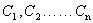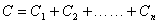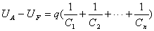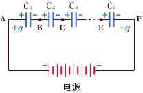 设有 n 只电容器,电容分别为 ,串联的方法如右下图所示。这里,每一只电容器的每一极板都只和 另一只电容器的一个极板相连接。把电源接到这个组合体两端的两个极板上进行充电,使两端的极板上分别带正、负电荷 和 ,并由于静电感应,每个电容器的两极板上亦分别感应出等量异种电荷