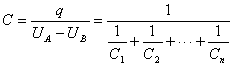 现在我们把这一个电容器组当作为一个整体来看,它所储蓄的,也就是可资使用的电荷,只是两端极板上的电荷 ,这两端极板的电势差是 。所以这一组合的等值电容 为